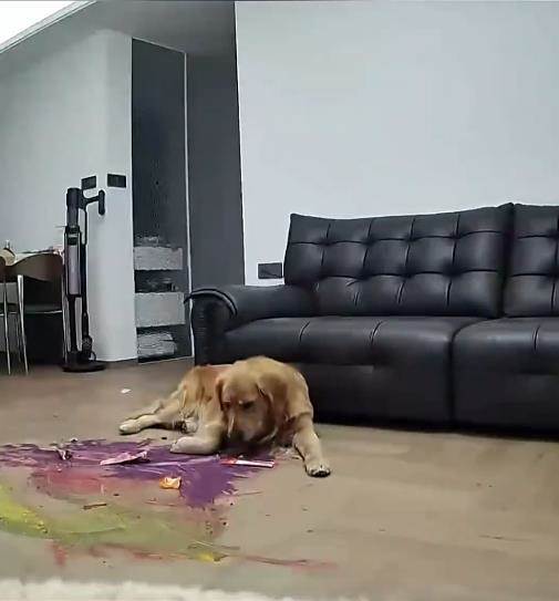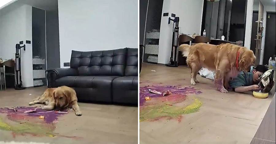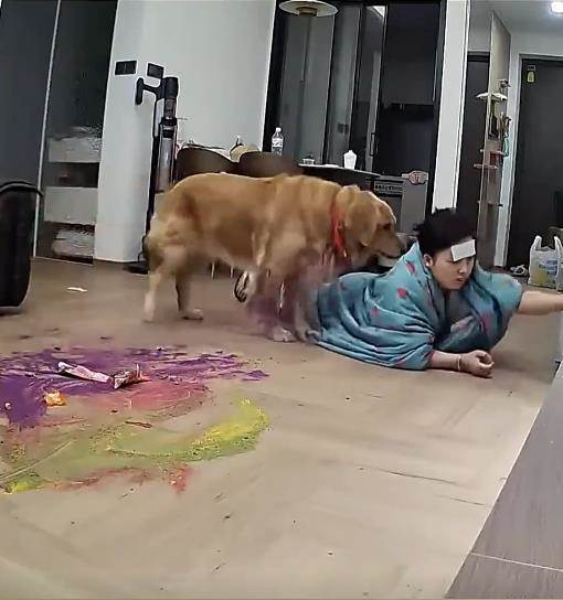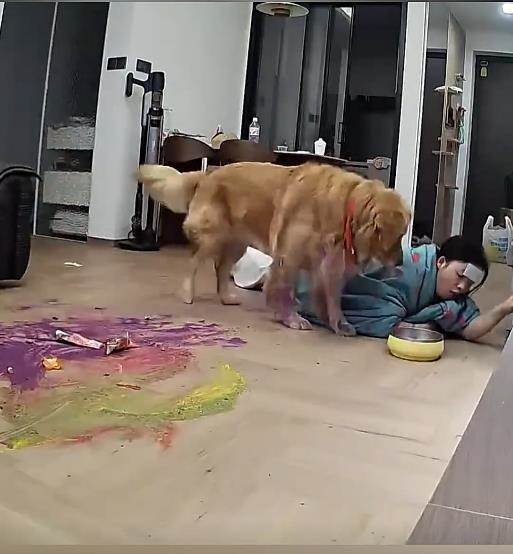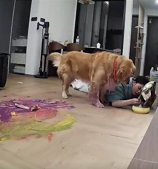 哭笑不得!女生得了甲流在家裡發燒到 40 度無力下床,可迷迷糊糊中,卻發現一個奇怪的事情,就是家裡的金毛在客廳不知道怎麼那麼安靜,于是拿出手機檢視監控,結果發現金毛已經餓的啃麵粉了,無奈之下,女子爬看下床來餵狗糧場面又心酸又好笑