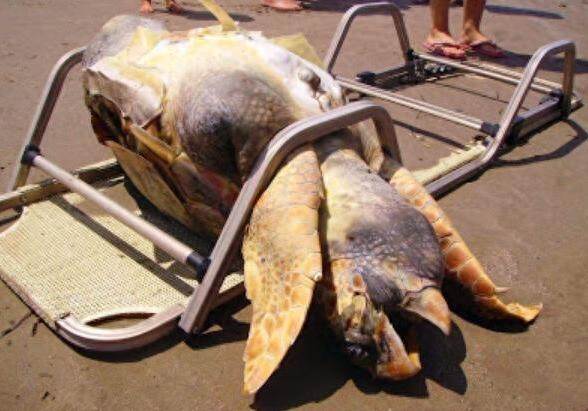 那是一只巨大的海龜,背甲比家里的圓桌還要大,殼上布滿了深淺不一的紋路,一看就有些年頭了。可此刻,這只本該在海洋里暢游的老海龜,卻被一個破舊的塑料座椅牢牢套住了身體,座椅的框架卡在它的背甲和腹甲之間,邊緣深深嵌進了它的皮膚里,周圍的鱗片已經泛白,還沾著干涸的血跡。老海龜趴在沙灘上,四肢偶爾微微動一下,眼神里滿是疲憊和痛苦,連抬頭的力氣都沒有。