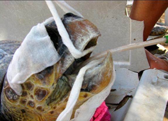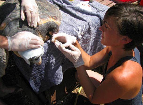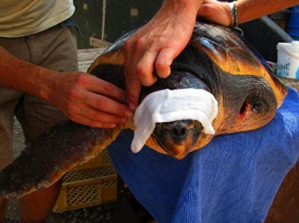 費了一個多小時,工作人員終于把塑料座椅從海龜身上取了下來。
