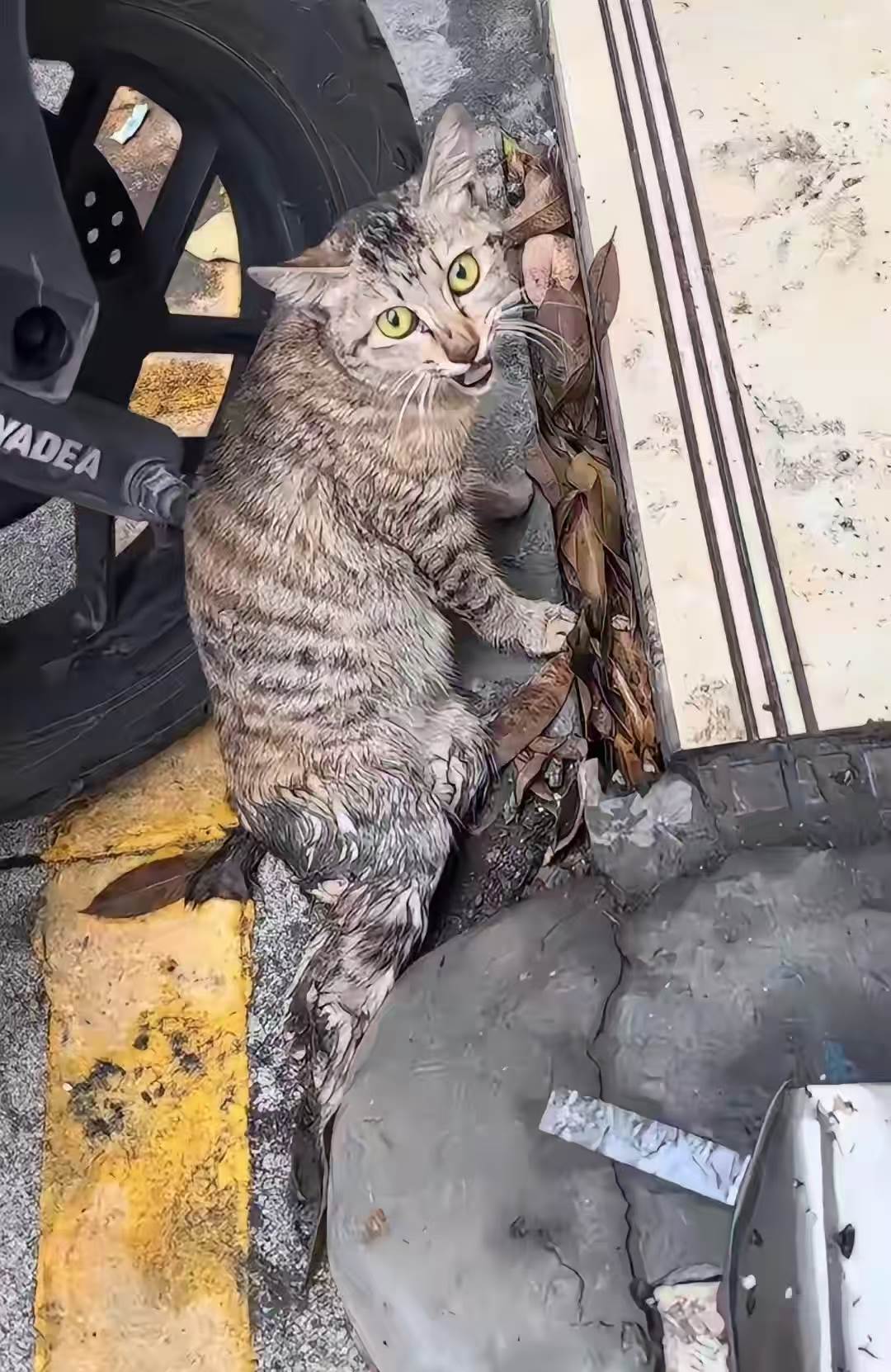 那天清晨,一位年輕的小哥哥像往常一樣出門跑步,當他經過一間公司門口時,一陣細微的貓叫聲讓他停下了腳步。在電動車輪與牆縫的狹縫裡,一隻滿身髒汙的虎斑貓正顫抖著,後腿癱軟在地上,連掙扎的力氣都沒有。牠的毛髮沾滿灰塵與血跡,原本靈動的雙眼此刻只剩下驚懼與絕望。小哥哥心頭一緊,立刻蹲下身輕輕撫摸牠的頭,這隻流浪貓竟沒有掙扎,反而用盡力氣蹭了蹭他的掌心,彷彿在說:「救救我。」