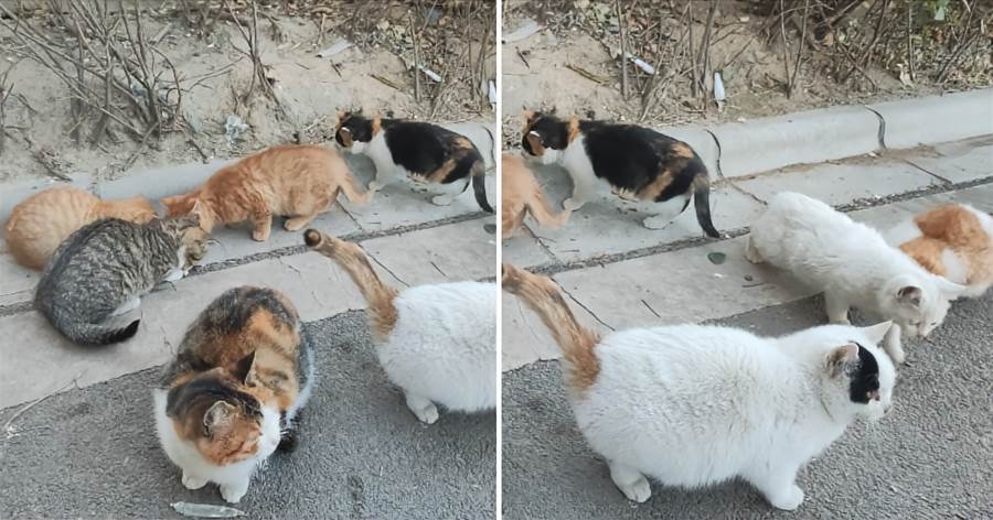 她提著貓糧袋子走來,一邊輕聲喚著,一邊蹲下身倒出糧食。這一幕,已成為這個小區裡持續數年的日常。
