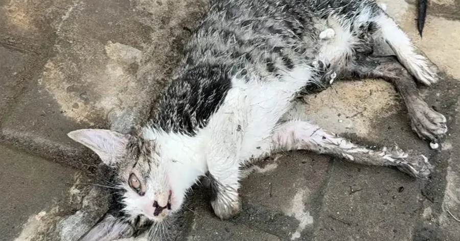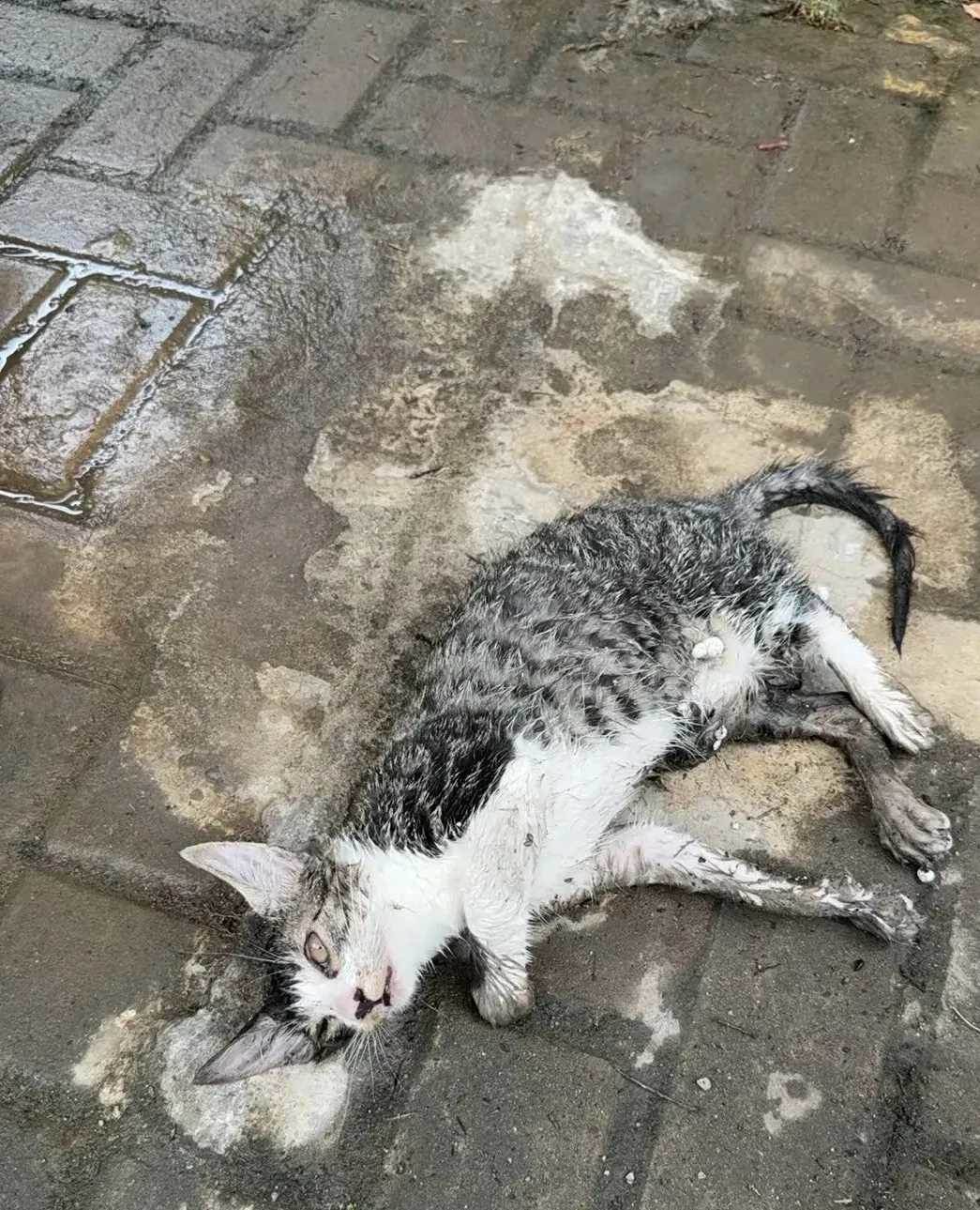 我聽了心里一沉,趕緊找了個舊紙箱,套上雨衣就往樓下跑。電瓶車棚在單元樓拐角,剛走近就看見棚子角落縮著個小小的身影 —— 是只巴掌大的小貓,渾身的毛被雨水泡得濕淋淋的,貼在身上,像團沒擰干的抹布,一動不動地趴在地上,看著確實沒什麼生氣。