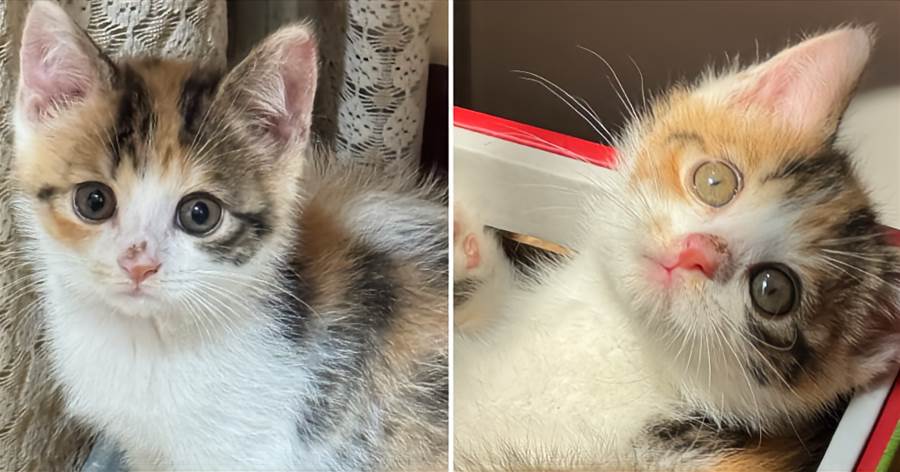 是只三花貓。絨毛還沒長齊,白、黃、黑三色淺淺地混在一起,像一團沒揉勻的毛線。