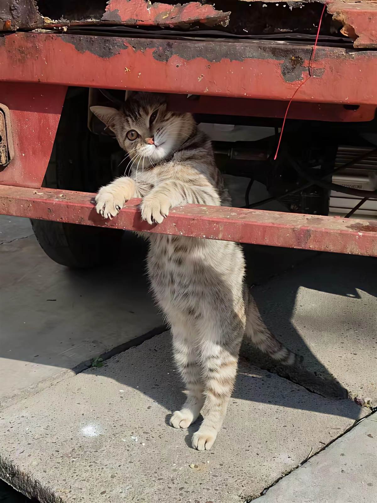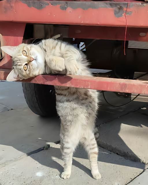 現在牠大了,知道看車。我下車搬貨,牠就鑽進車底,露出一截橘尾巴尖,偶爾有野貓路過,牠也不跟去。有次我故意躲牆角看,牠發現我不見了,整隻貓愣住,然後一聲接一聲叫,不是平常那種喵,是扯著喉嚨喊。我從牆後探出頭,牠飛奔過來,撞進我懷裡。