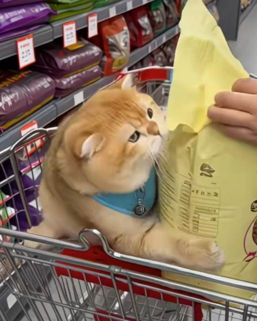 那包印著深海魚圖案的貓糧,正是牠在家最愛的那款。我停下車,拿起檢視價簽:312元,4斤裝。正思索著家裡庫存,忽然手上一沉——阿咪不知何時已伸出雙爪,緊緊抱住包裝邊角,甚至用牙輕輕銜住袋口,琥珀色眼睛直直望向我。