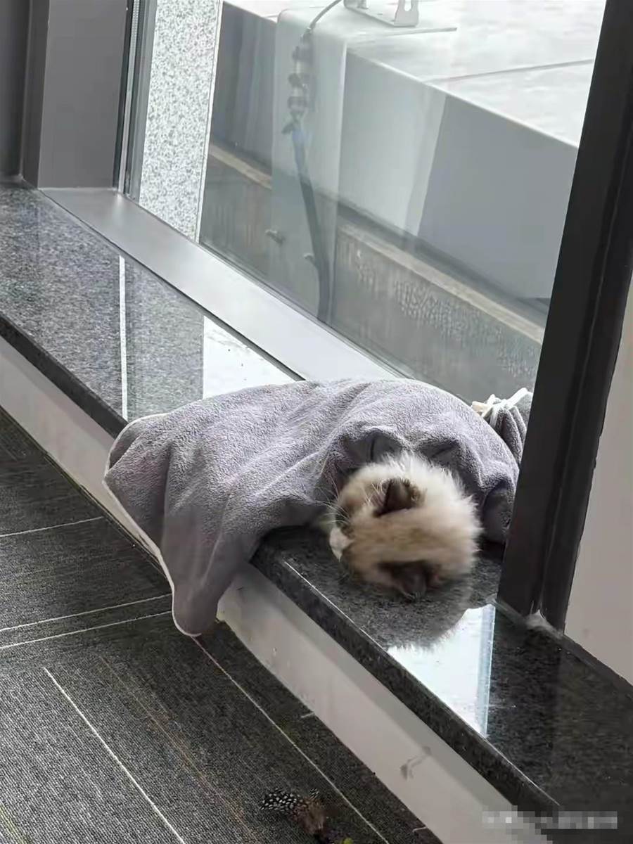 我看著它蜷縮的小模樣,心里有點發緊。窗台是大理石材質,被雨水澆得冰涼,它就那麼直接趴在上面,身上的濕毛還沒干,萬一著涼了可怎麼辦?我想起自己儲物柜里有一條閑置的淺灰色毛巾,是之前加班時用來蓋腿的,軟乎乎的還挺暖和。