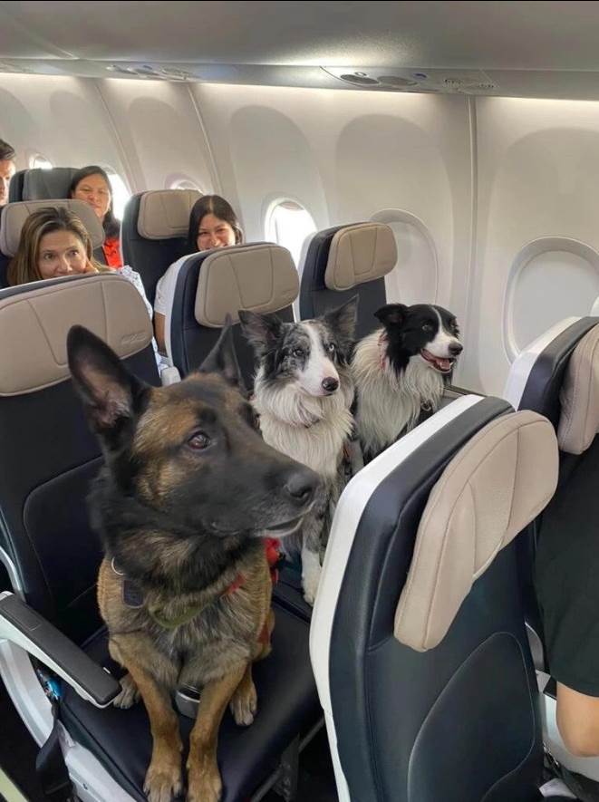 再看眼前的牠們,飛機顛簸時,中間的藍色邊牧會輕輕靠向旁邊的夥伴;遇到氣流,最前面的德國牧羊犬也只是豎起耳朵,眼神依舊平靜。