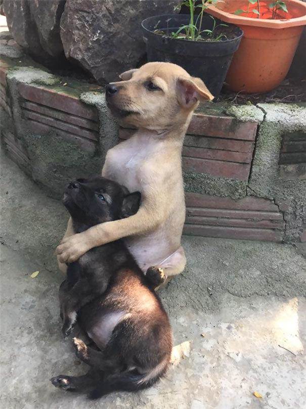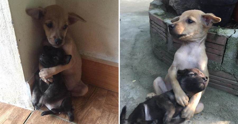 其實大狗的體型並沒有比小狗大太多,但它全程都緊緊摟著小狗,時刻護在身旁,像是在安撫內心可能充滿恐懼的夥伴,用自己的方式為對方撐起一片小小的避風港。