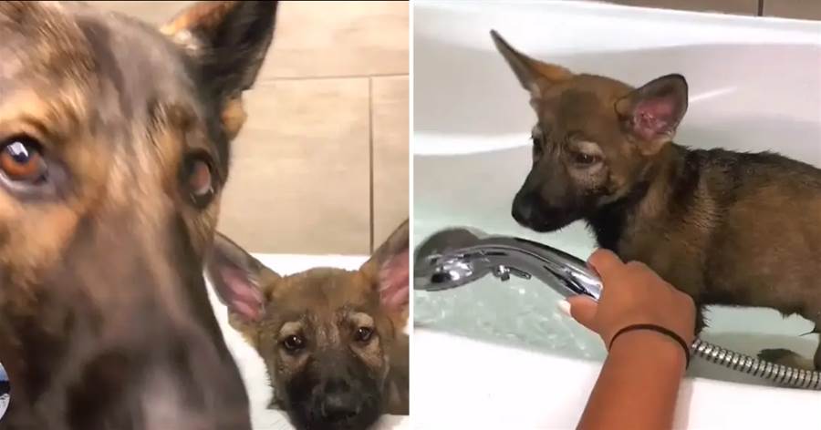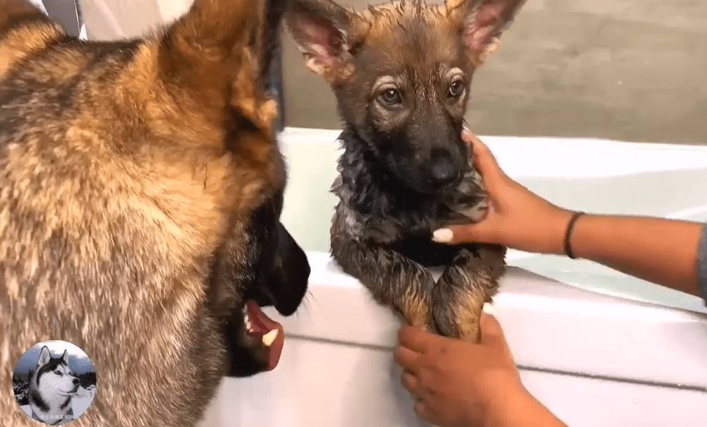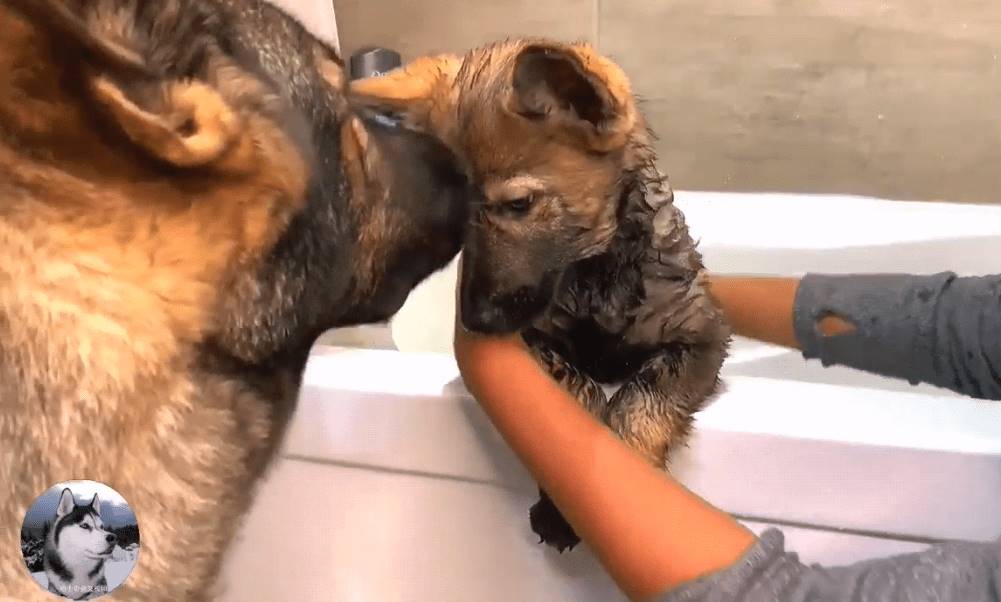 小狗把頭趴在了浴缸邊緣,用特殊的眼神看著自己的媽媽,主人則在一旁不停說明,試圖說服德牧媽媽讓它走開。