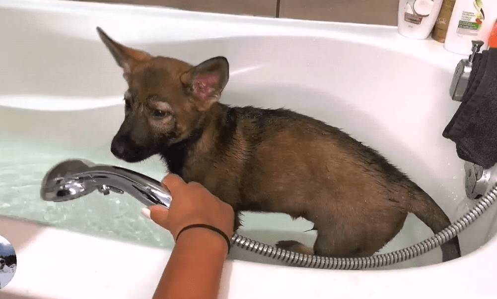 鏟屎官開啟了花灑,開始給小德牧洗澡。