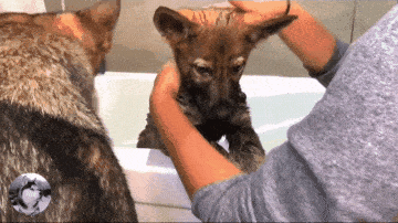 雖然德牧媽媽在睡覺,但是主人也有點擔心,所以就很快速地給小狗洗了個澡,後來鏟屎官想每次都這樣「偷偷摸摸」也不行,所以就決定光明正大地給小德牧洗澡一次,希望狗媽明白,自己是不會傷害它的。