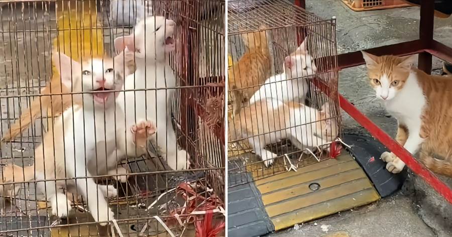 另一隻白底橘斑的貓蜷在地上,前爪被捕鼠夾死死咬住。牠抬頭看我,眼神裡滿是痛苦與警覺,卻沒有逃跑的力氣。引路的玳瑁貓輕輕走到同伴身邊,低下頭,一遍遍舔著牠額間的毛,喉嚨裡發出溫柔的呼嚕聲,彷彿在說:「別怕,幫手來了。」