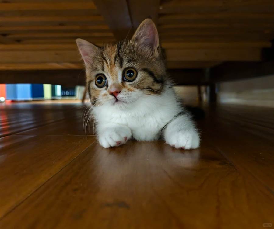 可剛打開家門,這股興奮就被澆了點小冷水。我還沒來得及把它放到地上,它 「嗖」 地一下就從懷里竄出去,順著沙發腿鉆到了最底下,只留下個小小的影子,連尾巴都藏得嚴嚴實實。我蹲在沙發邊,腦袋湊過去看,只能看見一雙亮晶晶的眼睛,在黑暗里忽閃忽閃的。