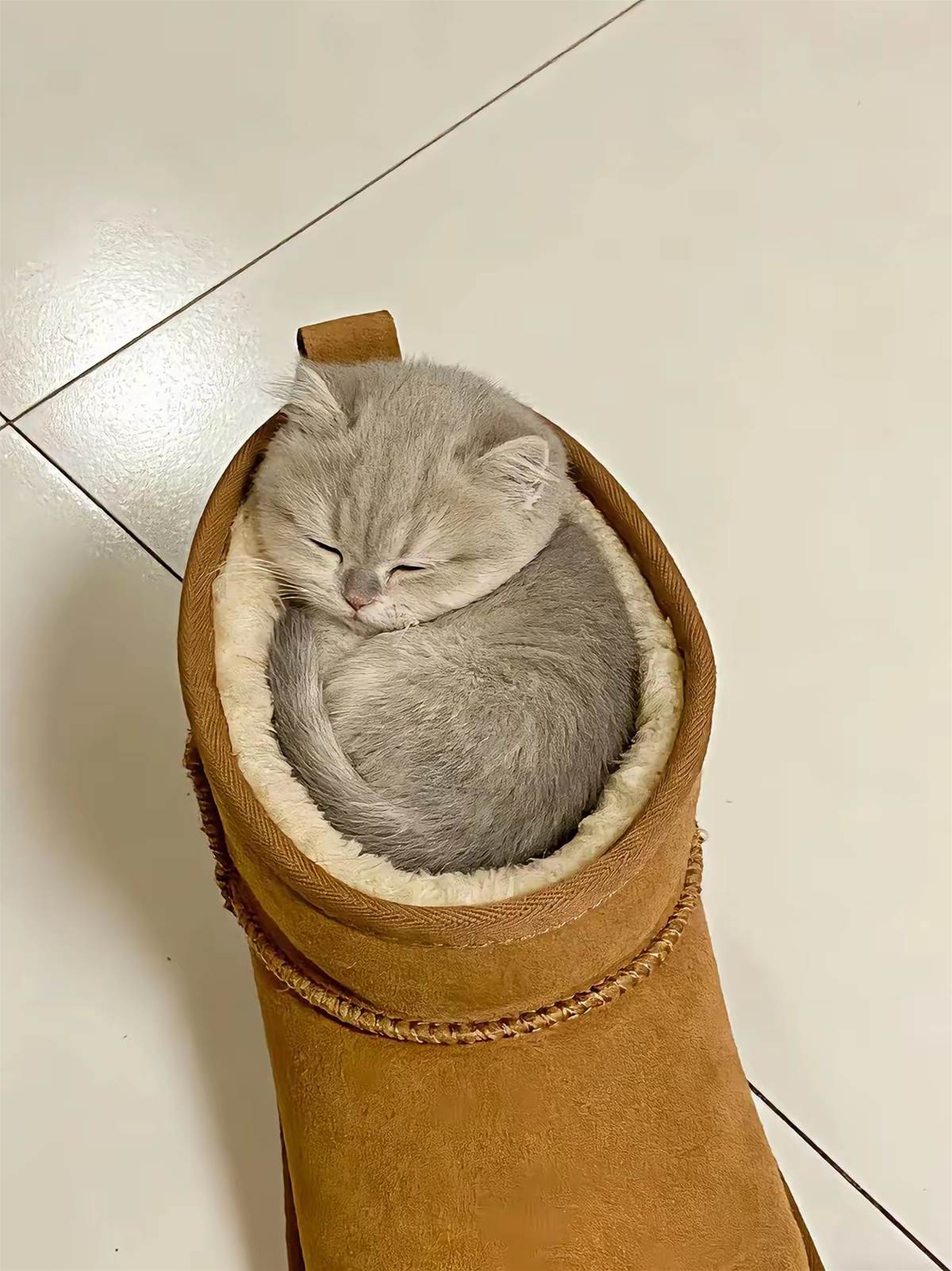 它把自己完美地塞進了鞋裡,頭和前爪蜷在鞋頭,身體盤在鞋筒中,睡得正香。我的出現驚動了它,它迷迷糊糊地睜開眼睛,看到是我,輕輕「喵」了一聲,又把頭埋回爪子裡繼續睡了,彷彿在說:「別吵,這裡很暖和。