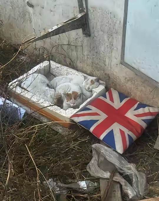 于是,我翻找出一個以前裝水果用的、厚厚的白色泡沫箱,又把我舊沙發上一個雖然褪了色、但依然蓬鬆柔軟的坐墊拿了來。趁著午後有一絲稀薄的陽光,我慢慢走到柴房邊,輕手輕腳地把箱子倚在牆角背風的地方,再把坐墊仔細地鋪在裡面。做完這些,我並未走遠,只是隔著一小段距離悄悄望著。過了約莫半個鐘頭,那只最膽大的橘貓先試探著靠近,用鼻子嗅了又嗅,隨後便小心翼翼地鑽了進去。另外兩隻花紋貓見狀,也挨挨擠擠地跟著蜷縮了進去。看到它們終于接納了這份簡陋的禮物,我才安心地轉身回屋。