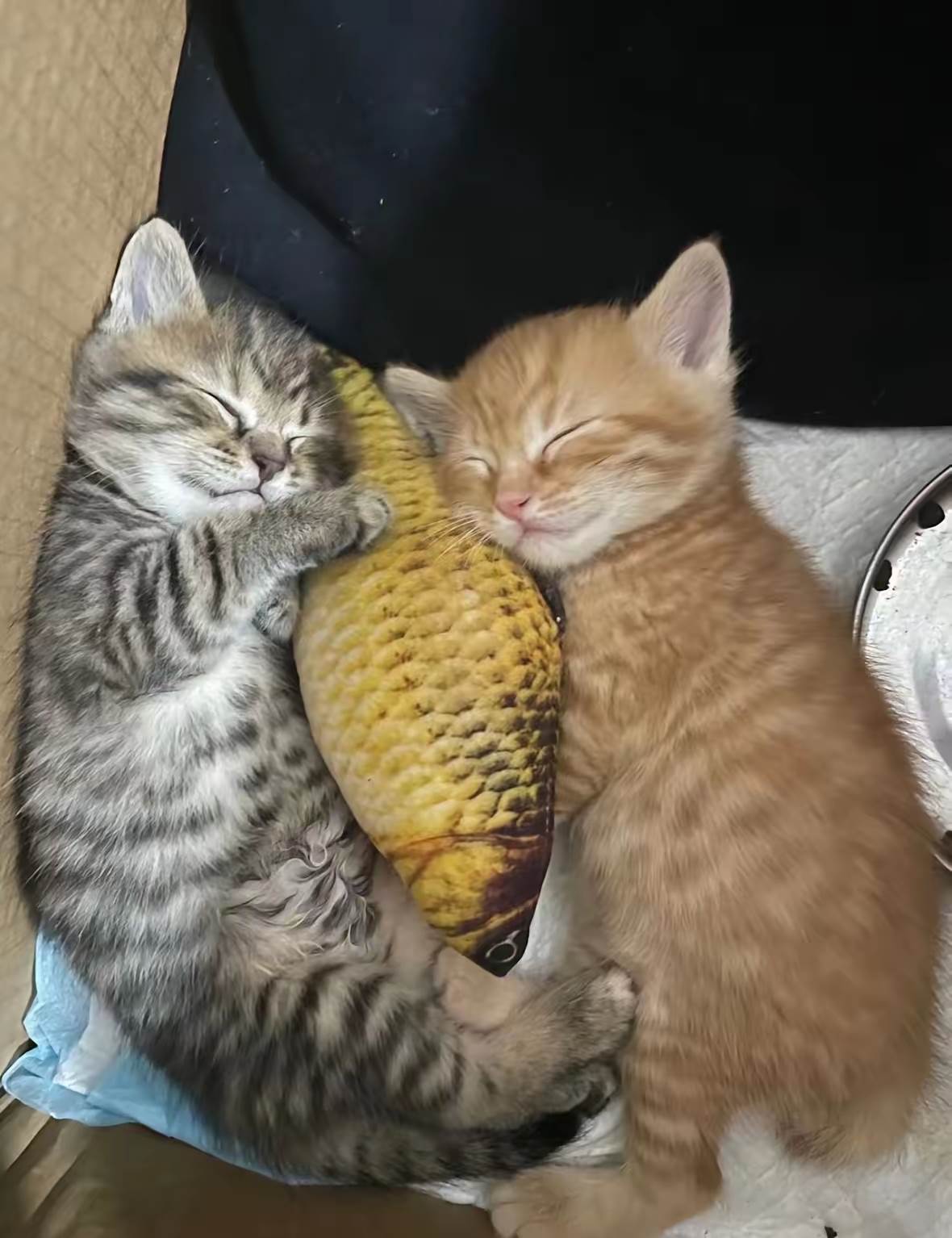 有天我收拾屋子,找出兒子小時候玩的小金魚毛絨玩具,隨手放進小貓的窩里。沒想到從那以后,只要睡覺,兩只小貓就會一起摟著小金魚,一個抱著魚頭,一個貼著魚尾,小腦袋靠在一起,像極了當初它們守著貓媽媽的模樣。我知道,它們還在想媽媽,那個小金魚,是它們對媽媽的念想。