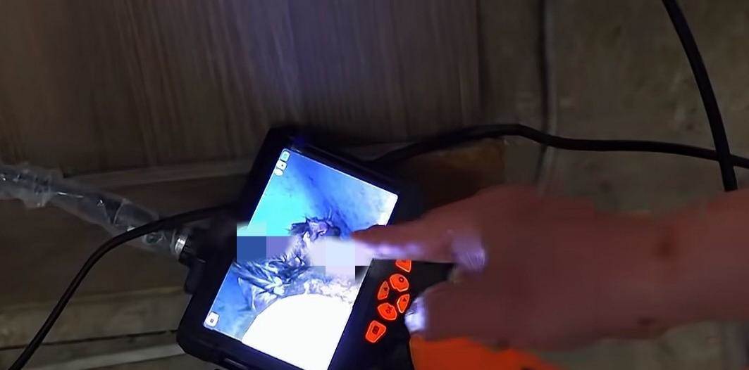 他們拿來內窺鏡伸進了縫隙中,鏡頭裡一隻貓咪蜷縮在3m深的柱子底,叫的聲嘶力竭。