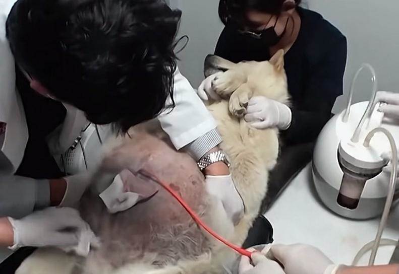 時間經不住等待了,手術需要立即進行,醫生將導管小心[插·入]小白狗的肚子,醫生抽出了足足20kg的積液,裝滿了多個容器。難以想象它是如何拖著這樣沉重的負擔艱難求生的。