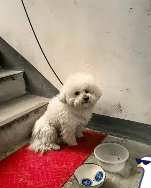 它蜷在冰冷的樓道紅墊上,毛髮沾著灰塵,原本蓬鬆柔軟的捲毛打結成一團團,像被風吹亂的白雲。腳邊的塑膠食碗永遠半空,偶爾積著幾滴髒水,卻從未見過滿滿的狗糧。曾經,它是阿姨懷裡最嬌貴的寶貝,會鑽進懷中撒嬌,會搖著尾巴迎接晚歸的腳步,會在沙發上蜷成一團,陪阿姨度過一個又一個安靜的夜晚。可如今,阿姨已經離開了這個世界,這隻曾被捧在手心的小狗,就這樣被遺忘在無人問津的樓道轉角,成了這座冷漠大樓裡,一個被忽視的溫柔存在。
