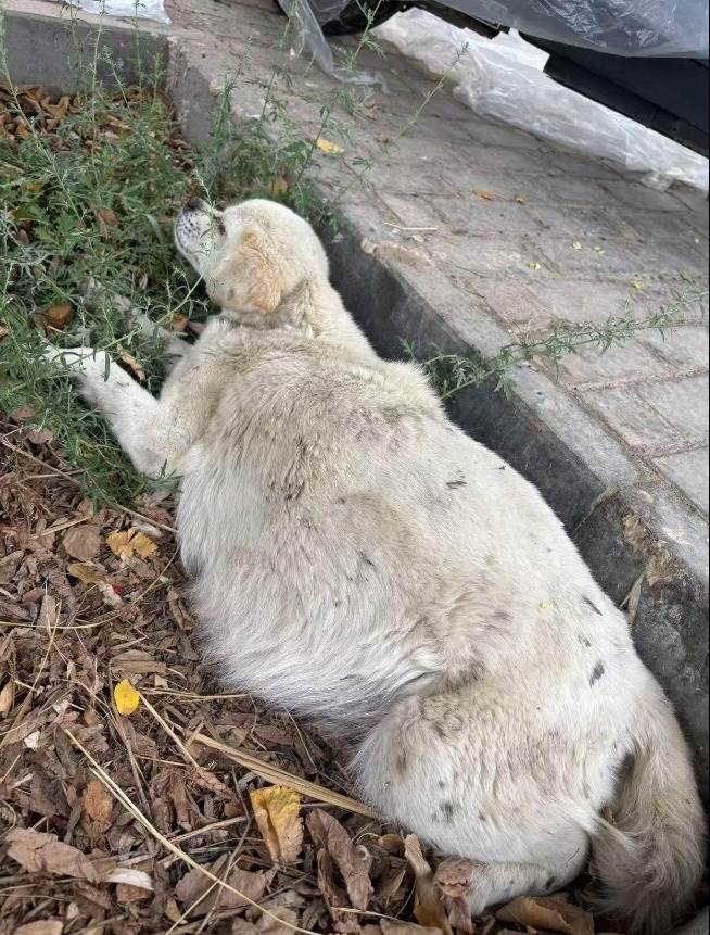昨天傍晚下班,路過巷口那棵老槐樹下,我一眼就看見石台底下縮著個白色的身影 —— 是那只常在附近徘徊的母狗,只是這次,它沒像往常那樣躲著人,反而一動不動地躺在那兒,眼神蔫蔫的,連耳朵都耷拉著。