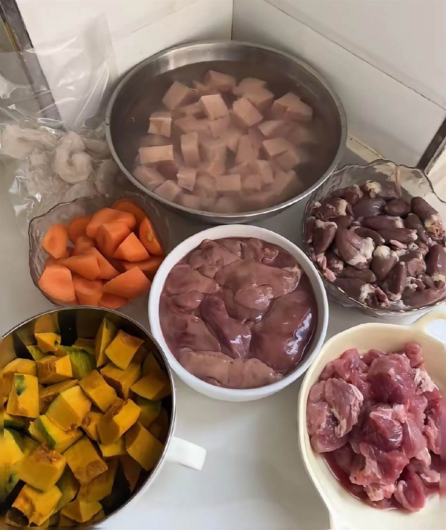 傍晚的小區花園裡,一群流浪貓圍著一個不鏽鋼盆吃得津津有味。盆裡裝著的不是市面上常見的貓糧,而是散發著熱氣的自制貓飯——新鮮雞肝、雞心、雞胸肉搭配南瓜和胡蘿蔔攪拌成糜狀,炒熟後香氣四溢。這是博主「貓巷裡的陽光」每天為流浪貓準備的晚餐。