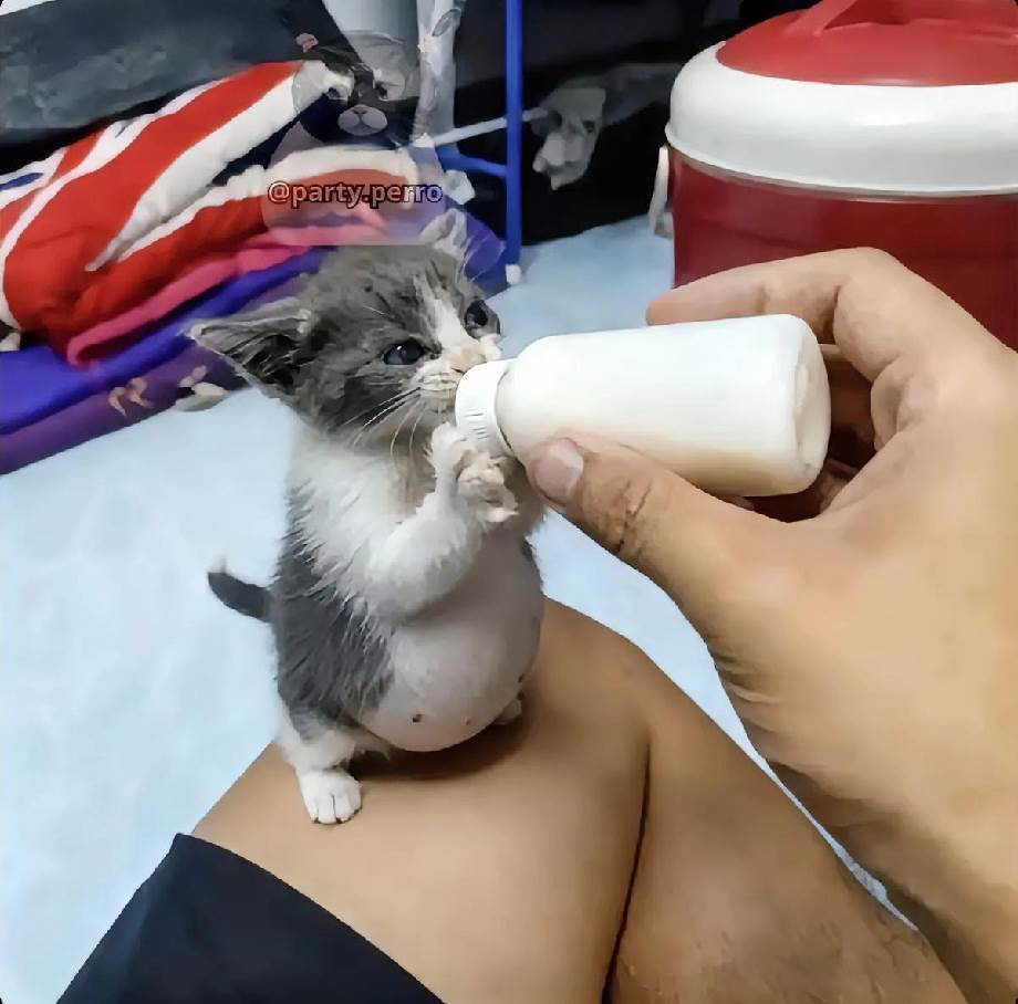 小貓餓壞了,一聞到溫熱的羊奶就急切地湊上來。我小心地餵著,看牠急切吮吸的模樣,心裡既心疼又滿足。一整瓶奶很快見底,小肚子鼓得像顆小球,但牠還是伸著爪子想[抓.奶]瓶,我把奶瓶拿開時,牠整隻貓幾乎要撲上來。