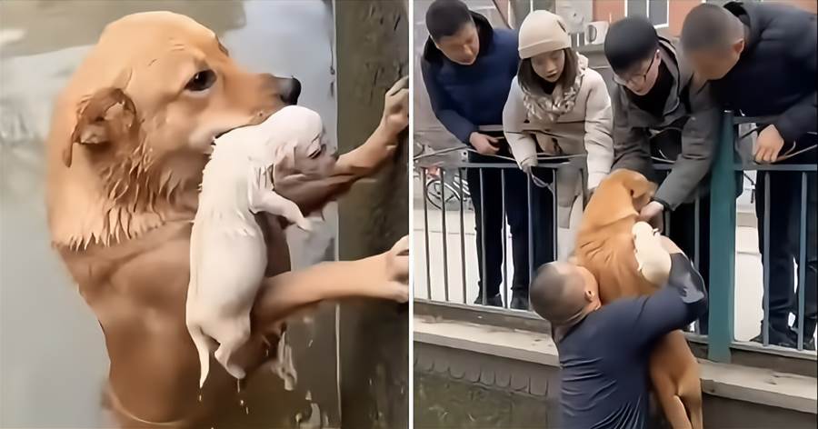 「這狗媽媽太可憐了,肯定是想把孩子遞上來!」「可惜欄桿太高,我們夠不著啊!」「水這麼涼,再待下去母子倆都要出事!」圍觀的人七嘴八舌地討論著,有人試圖伸手去夠,可距離太遠,根本無法觸及。狗媽媽似乎察覺到了大家的無力,叼著小奶狗的嘴又緊了緊,身體因為寒冷和疲憊開始搖晃,眼看就要站不穩。
