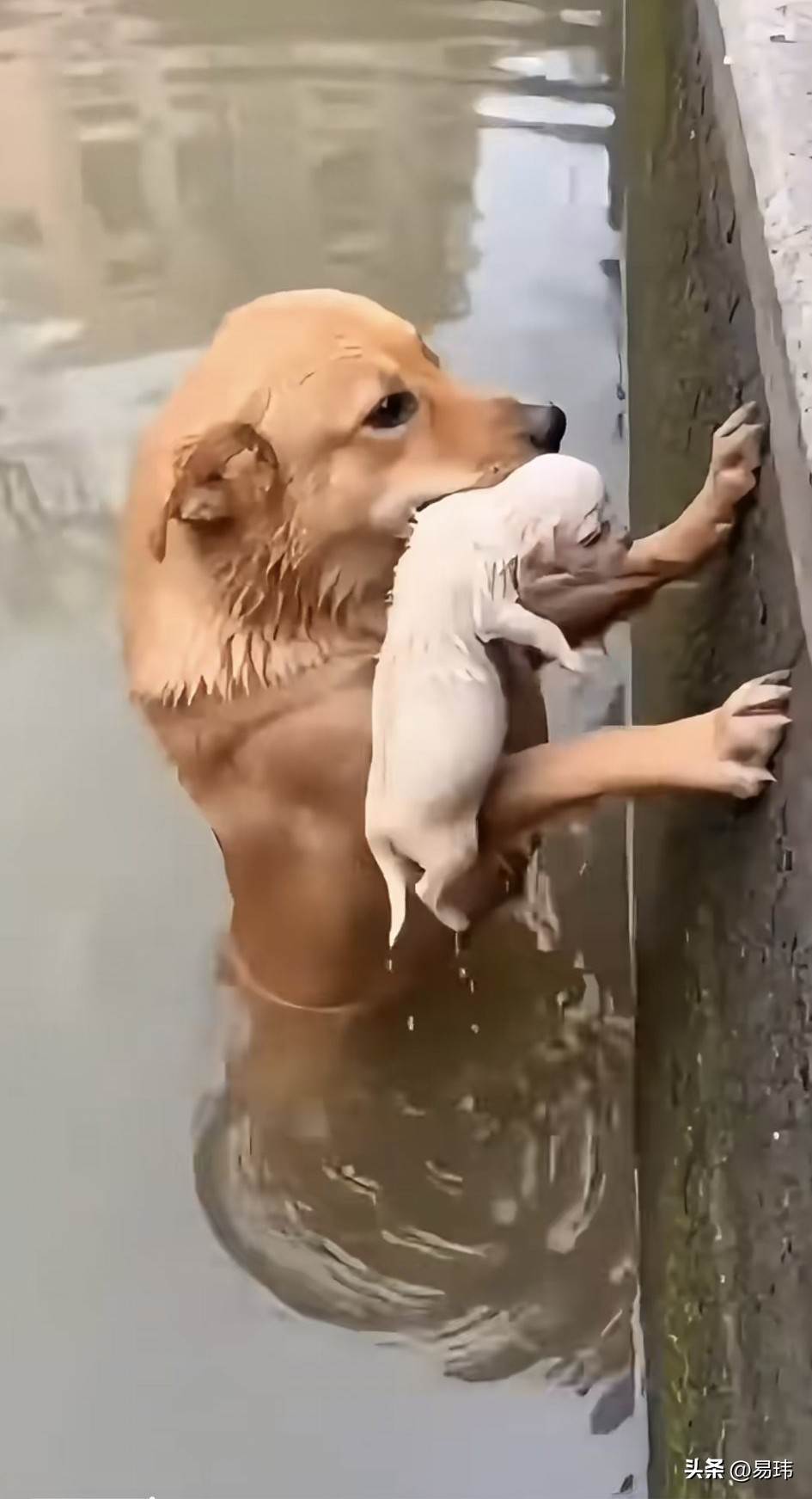 只見不少晨練的路人圍在河邊的欄桿旁,踮著腳尖朝水裡張望,臉上滿是焦急與無措。大哥心中泛起好奇,放慢腳步湊了過去。順著眾人的目光往下看,眼前的一幕讓他瞬間揪緊了心——渾濁的河水中,一隻瘦弱的狗媽媽正艱難地站立著,冰冷的河水沒過了它的膝蓋。它的身體微微顫抖,卻始終穩穩地昂著頭,嘴裡緊緊叼著一隻奄奄一息的小奶狗,用盡全身力氣把腦袋往欄桿方向湊,眼神裡滿是哀求,像是在向岸邊的人求救。