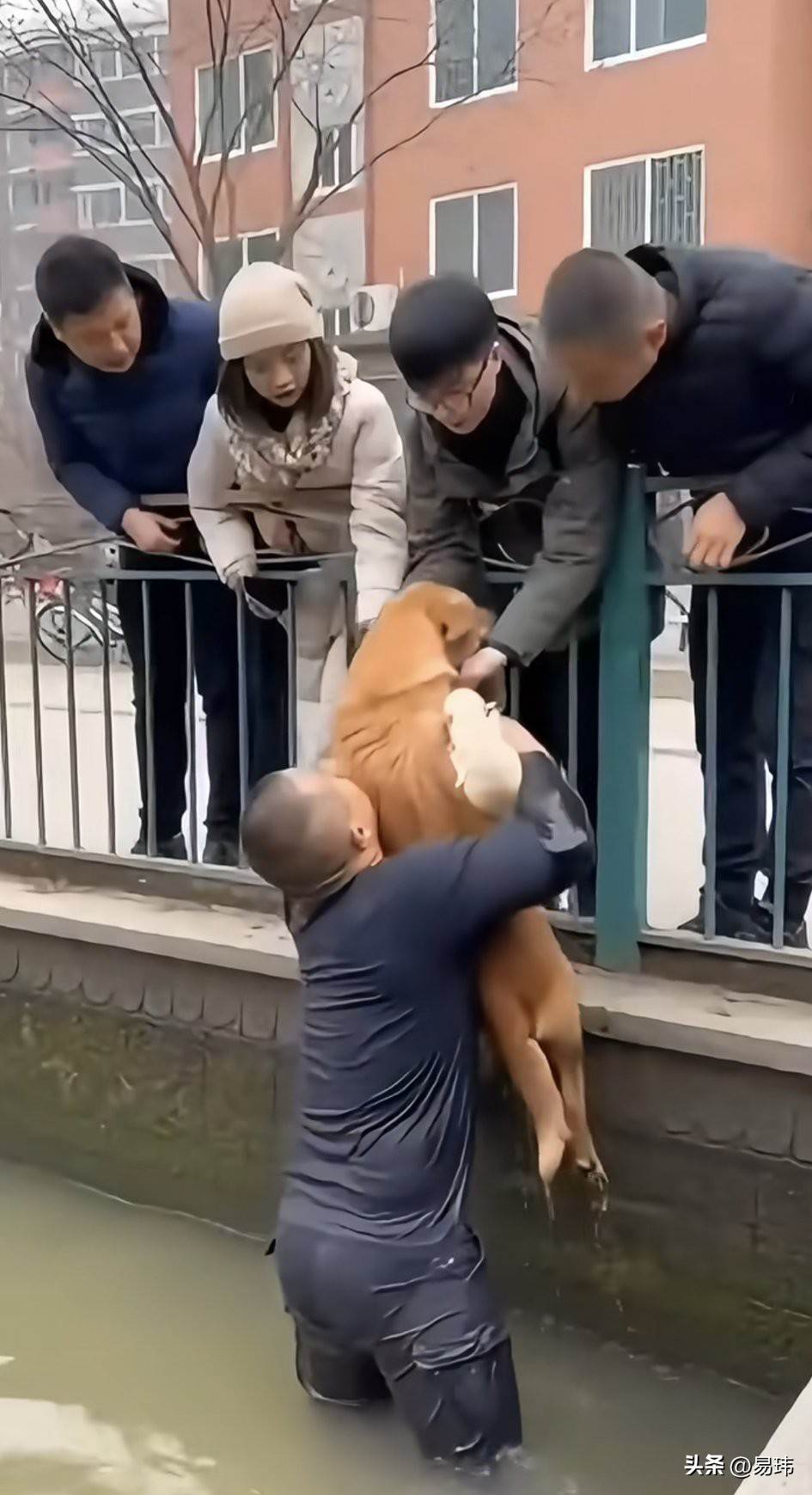 大哥小心翼翼地伸出手,先輕輕托住小奶狗,幫狗媽媽減輕負擔,隨後一把將狗媽媽抱進懷裡。狗媽媽體重雖輕,可在水中帶著浮力,想要託舉起來並不容易。大哥咬緊牙關,憋足力氣,奮力將懷裡的狗狗母子往上舉。岸邊的圍觀者見狀,立刻紛紛伸出手,有人托住小奶狗,有人拉住狗媽媽的爪子,齊心協力地把它們拉上了岸。