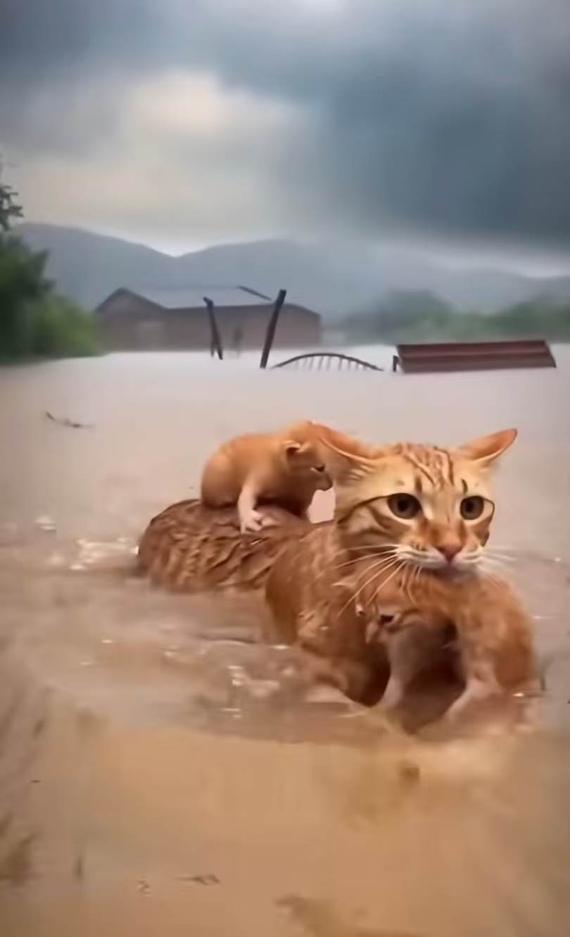 洪水湍急,貓媽媽冇絲毫猶豫。佢一張嘴輕輕叼起其中一隻小貓嘅後頸,再用背脊小心翼翼托起另一隻,然後奮力跳入渾濁嘅水中。游水本來就吃力,何況要同時照顧兩隻幼崽?貓媽媽一路劃水,一路穩住身體,生怕小貓會跌落嚟。嘴裡叼住嘅唔可以太用力,會整親寶寶;背上嘅要平衡好,唔可以俾水流沖走。佢雙眼緊盯前方,四肢已經開始發軟,但心裡只得一個念頭:「一定要撐住,一定要帶佢哋去安全嘅地方!」