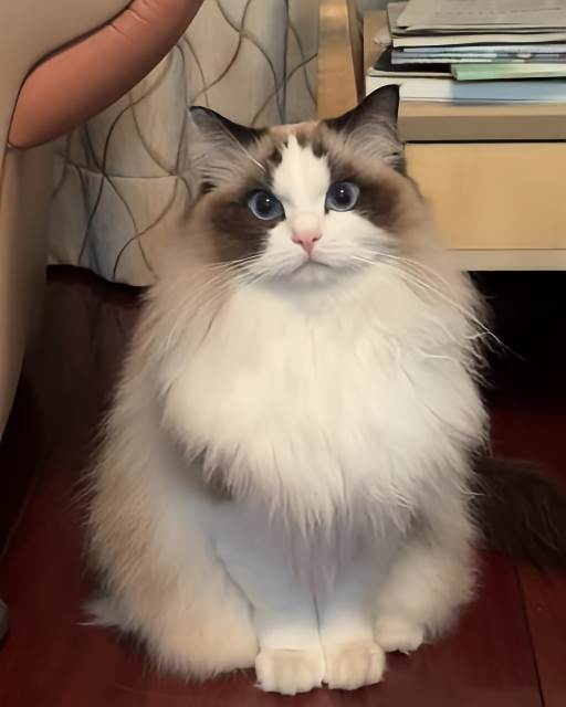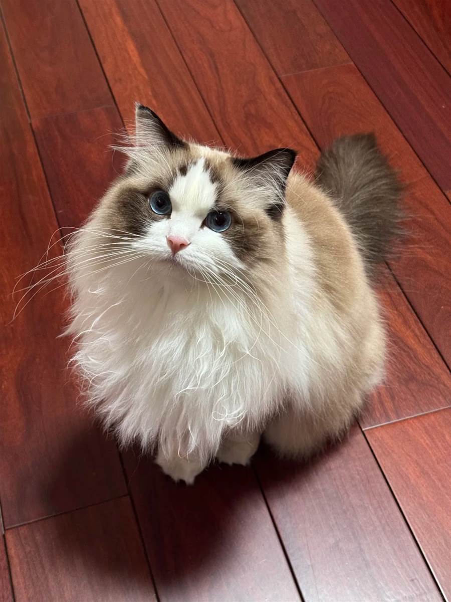 體型雖小,存在感卻一點不弱。每天下班開門,她準時蹲在玄關,藍眼睛亮晶晶地盯著我,尾巴輕輕掃著地板,蹭得我褲腿全是軟乎乎的毛。朋友打趣她「偷工減料」,她自己倒半點不自卑,該吃吃該喝喝,扒著碗沿小口吃飯,斯文得像個小公主。