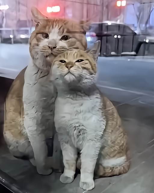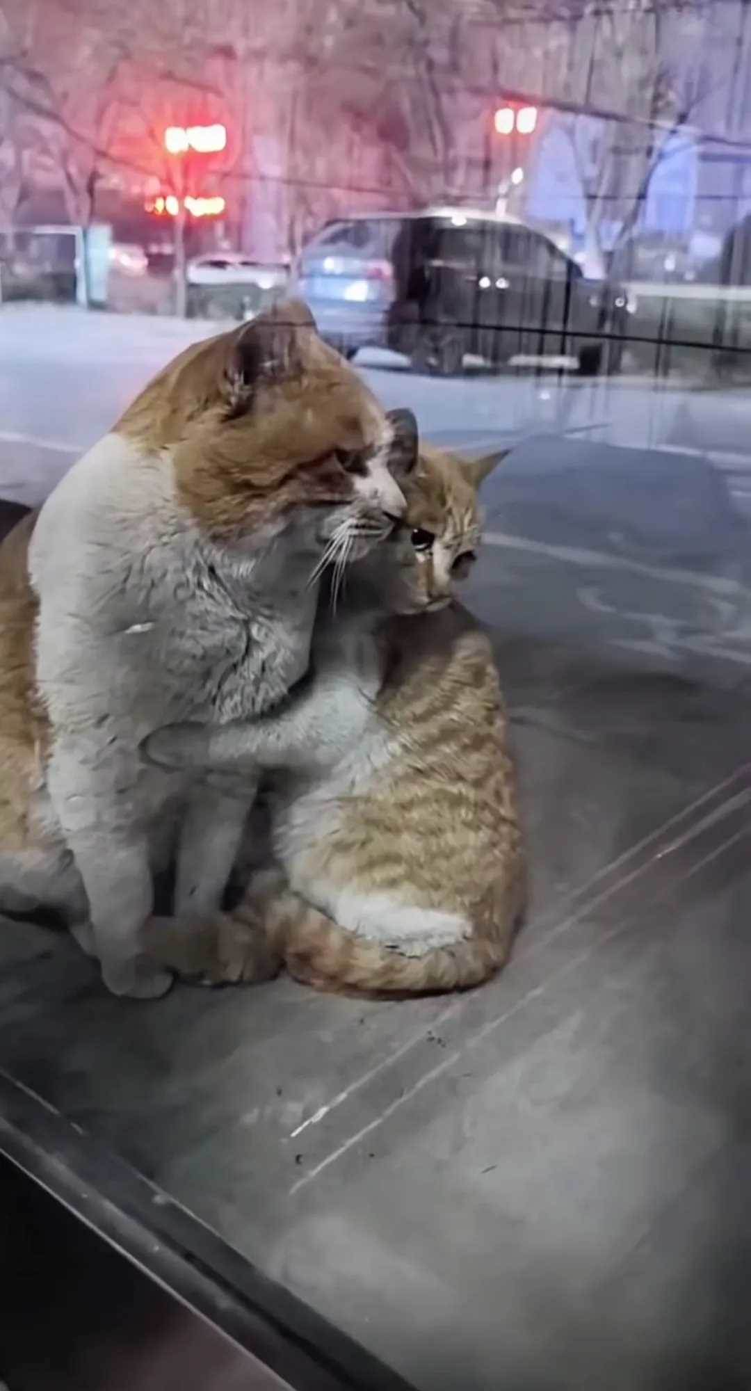貓媽媽身上沾了水氣,毛有點亂,但還是端端坐著,眼睛靜靜望進來。小貓半邊身子貼在媽媽後腿邊,可能是冷,尾巴卻依然翹得老高。