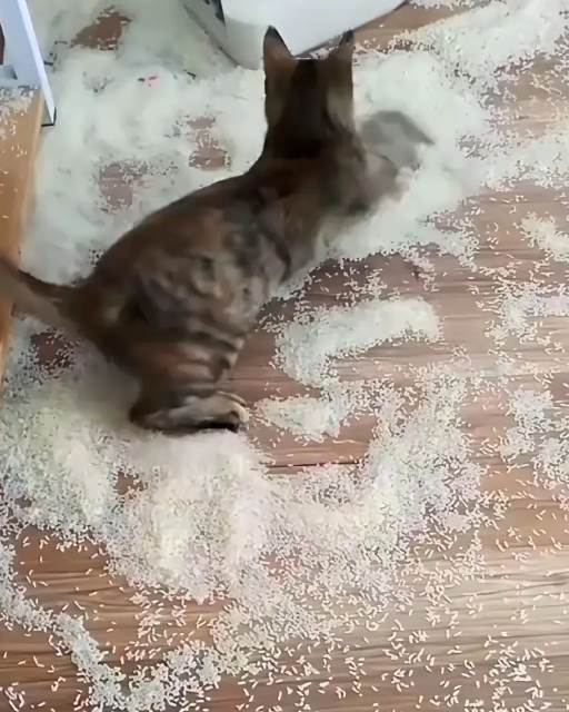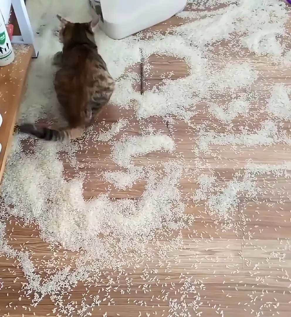 眼前是一片狼藉的「戰場」:半袋大米傾倒在地,白花花鋪了半個客廳,在燈光下泛著細碎的光。那只胖乎乎的貍花貓正怡然自得地在米堆裡「踏浪」,爪子一劃一撥,米粒便如浪花般四濺。貓毛混在米粒間,幾處還被扒拉成了小山丘。