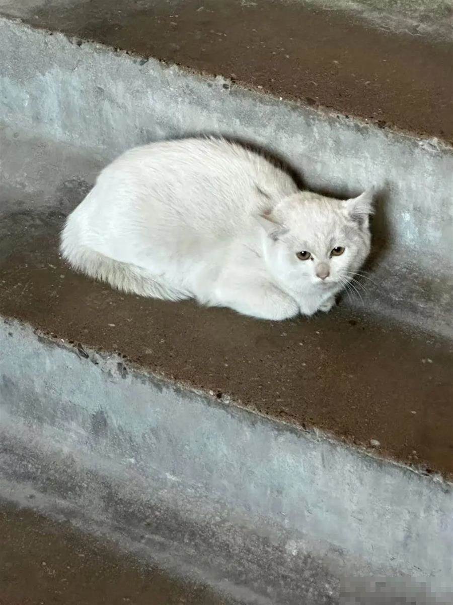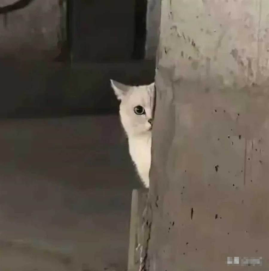 那天傍晚,剛拐過小區附近的路燈,眼角余光瞥見花壇后有團白色影子。回頭一看,是只半大的流浪貓 —— 渾身白毛沾著灰塵,一縷縷貼在身上,風一吹就亂飄,瘦得像片隨時會被吹走的羽毛。見我回頭,它 「嗖」 地縮回花壇后,只露出半個腦袋,圓溜溜的眼睛怯生生地望著我,那可憐兮兮的模樣,像做錯事怕被罵的孩子。