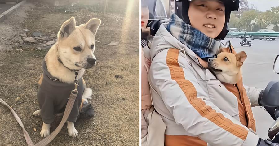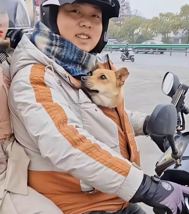 最感人的一幕是丈夫將狗狗小心翼翼地放在自己懷裡,只露出一個小腦袋,用外套緊緊裹住,確保狗狗不受寒風侵襲。妻子則負責攜帶行李。就這樣,這對夫妻開始了2000多公裡的騎行之旅。