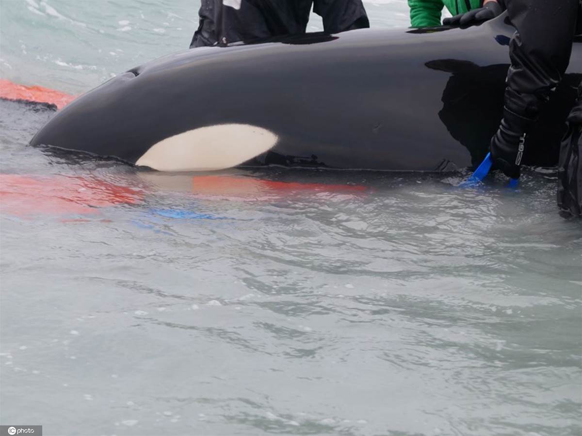 虎鯨似乎感受到了大家的善意,不再焦躁地擺動身體,只是睜著圓溜溜的大眼睛,靜靜地看著圍著它的人們,眼神裡滿是依賴。