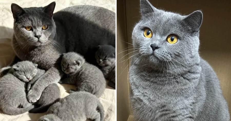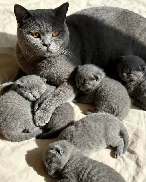 那陣子我只覺得牠肚子越來越大,還笑著揉牠臉說:「又偷吃多少零食啦?」直到那個加班的深夜,我推開家門,看見阿寶虛弱地躺在沙發角落,身邊竟蜷縮著六隻濕漉漉、灰藍色的小毛球——全是和阿寶一樣的藍貓寶寶,像復製貼上般整齊。