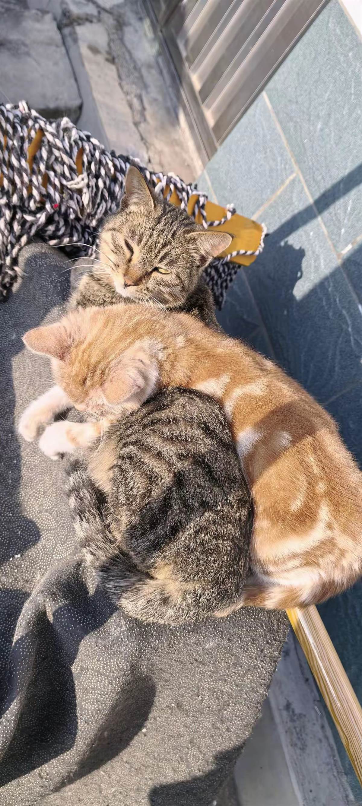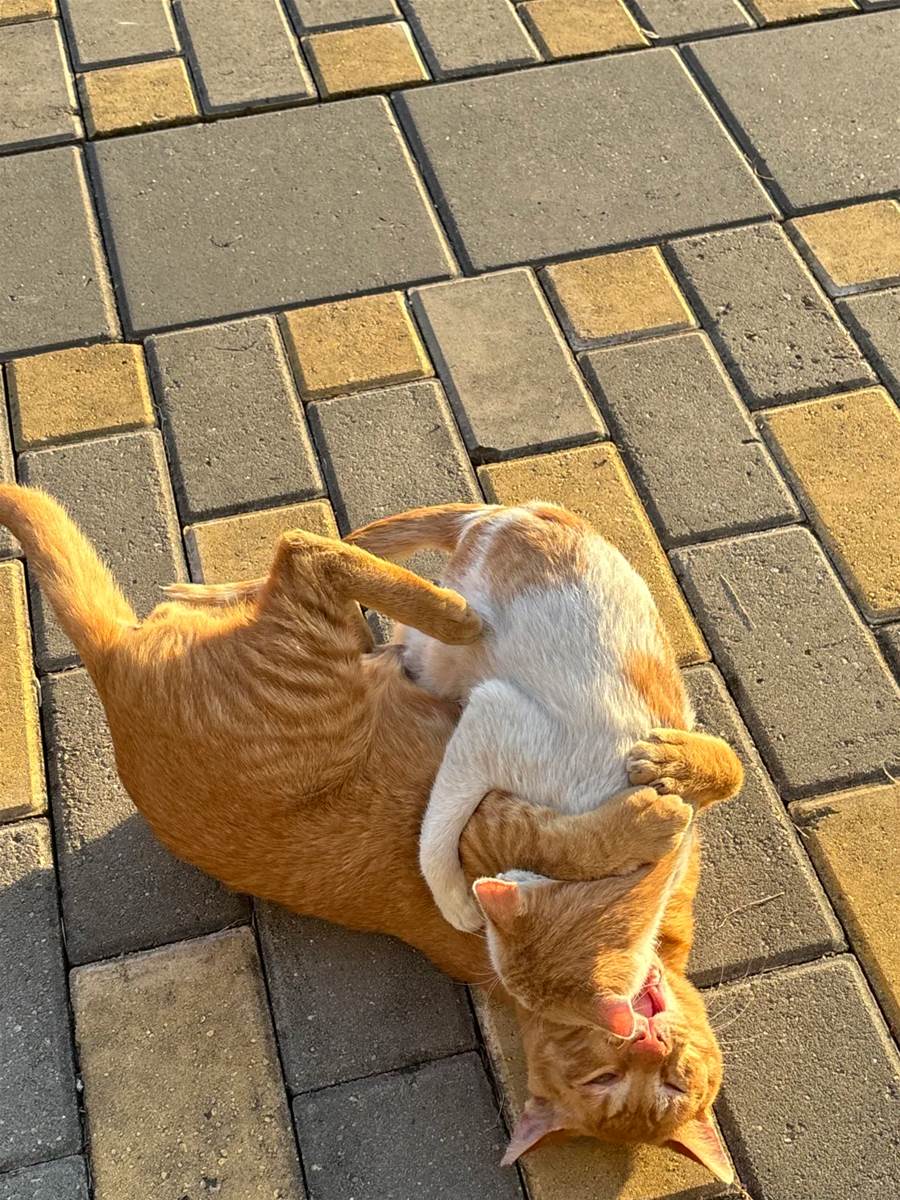 然而,事情的發展完全出乎我的預料。小橘不但絲毫沒有離開的意思,我家那位向來灑脫的貍花,竟也像變了隻貓似的。牠不再急著往外跑,反而處處護著小橘:吃飯讓她先蹭,溫暖的墊子讓給她窩,還會用頭輕輕蹭她,幫她理毛。兩個小身影從早到晚黏在一起,在落葉間追逐,在陽光下相偎打盹,那畫面甜得像是秋天的蜜糖。