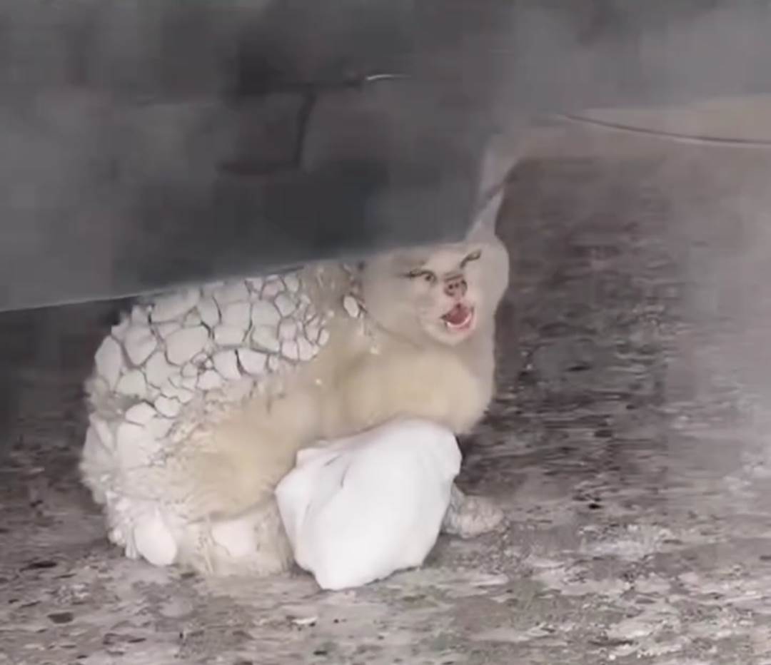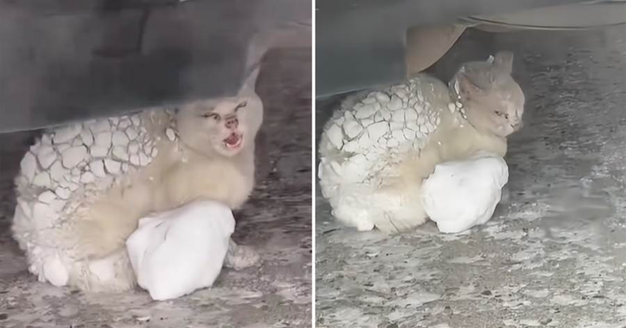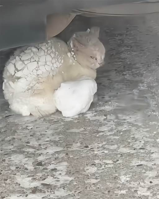 男子停下車,叫來了同行的父親。兩人小心翼翼地接近那只驚恐的小貓。它凍得瑟瑟發抖,貓毛上結的冰霜讓它看起來像個迷你的雪雕。「它的毛都凍硬了,上面結了厚厚的雪痂,如果不及時救助,肯定熬不過那天。」男子說道。
