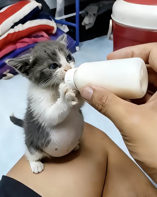 那天傍晚,在街角紙箱的陰影裡,我遇見了牠——一隻瘦得讓人心疼的小奶貓。不知在外面遭了什麼罪,牠餓得連叫聲都沙啞,只剩一雙圓溜溜的眼睛,寫滿了求生渴望。我匆匆衝了奶粉,將奶瓶遞到牠嘴邊。下一秒,牠整個小腦袋埋進奶瓶,咕嘟咕嘟地喝得又急又專注,彷彿這是生命中最後一餐。不過片刻,一整瓶奶見了底,牠的小肚子鼓得像顆圓球,卻仍不肯鬆口。我輕輕抽走奶瓶,牠竟搖搖晃晃地「掛」了上來,軟軟的小爪子勾著瓶身,依依不捨的眼神,瞬間融化了所有猶豫。