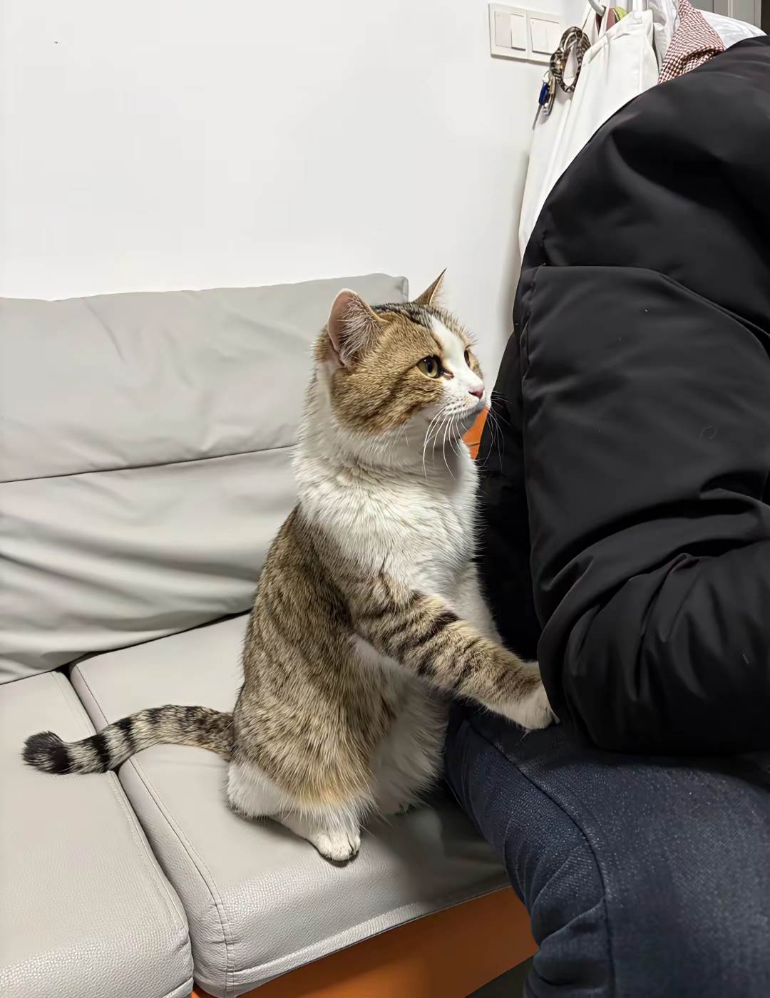 這次是個看起來挺溫和的男生,叫阿誠。他手裡沒提禮物,只是簡單點頭微笑,態度自在。我心裡正暗暗想著「這回連表面功夫都不做啦」,卻見一向高冷的米米,緩緩從沙發上站起來,輕巧跳下,走到阿誠腳邊。