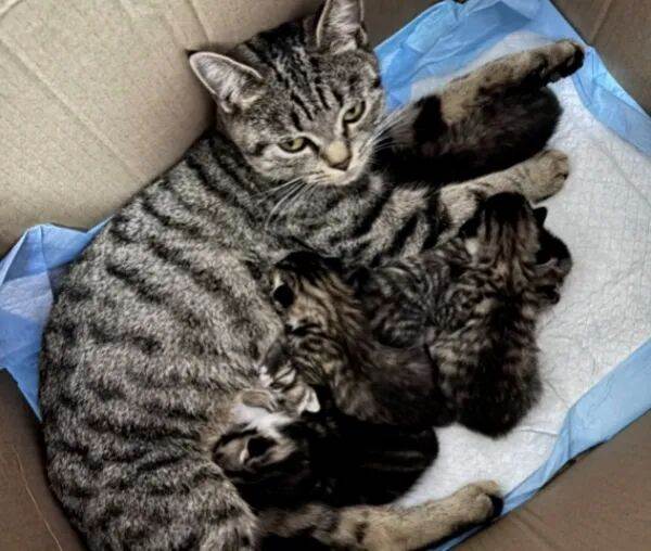 小花端坐在門口,身後緊挨著六隻毛茸茸的小貓,花色各異,有的虎斑、有的橘白,像一團團會呼吸的小毛球。貓媽媽抬頭輕聲「喵」了一下,眼神溫柔而信任,彷彿在履行一個無聲的承諾。
