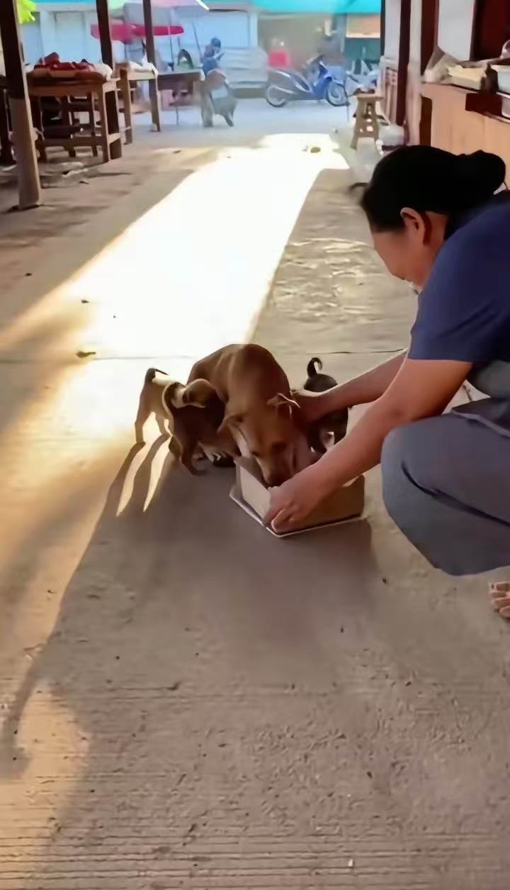 大叔心頭一酸,立刻轉身從蒸籠裡拿出幾個熱騰騰的包子,輕輕放在狗狗們面前。小奶狗們餓極了,湊上前小口啃咬,狗媽媽卻靜靜退到一旁守著,目光溫柔地看著孩子們吃,直到牠們吃飽散開,牠才悄悄走上前,低頭吃掉剩下的碎屑。牠把最後的溫柔與忍耐,都留給了自己的孩子。